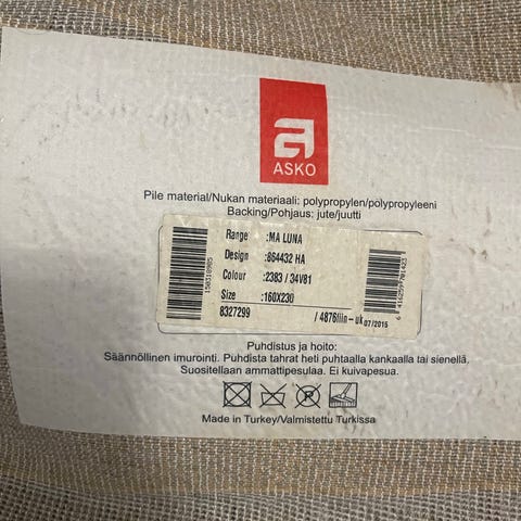 Askon Seela matto 160x230cm. Yksi tahra reunassa, muuten siistikuntoinen
