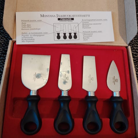 Fiskars Montana juustoveitset erilaisille juustoille 4kpl, laatikossa.