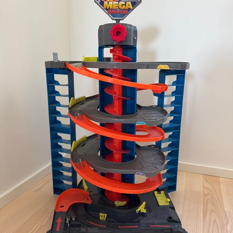 Hot Wheels autorata parkkitorni. Monikerroksinen torni, jossa spiraalinmuotoinen ajorata ja parkkitasoja pienille leluautoille. Sopii Hot Wheels -autoille ja vastaavan kokoisille pikkuautoille. Kuvassa mukana useita pieniä autoja, jotka voidaan ajaa tornin rataa pitkin alas ja pysäköidä eri tasoille. Soveltuu lasten leikkeihin sisäkäyttöön.