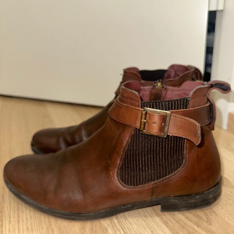 Nahkaiset ruskeat nilkkurit, koko 39. Kengissä on nauhakiinnitys ja vetolenkki kannassa pukemisen helpottamiseksi. Päällinen on sileää nahkaa ja pohja on kumia, jossa on kuviointi paremman pidon takaamiseksi. Kengät sopivat arkikäyttöön ja siistimpään pukeutumiseen viileämpiin säihin. Merkki Herring Shoes, malli Dainite.