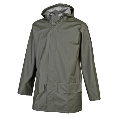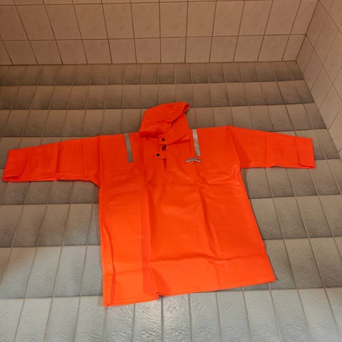 Helly Hansen sadetakki, koko XL. Takissa on sininen pohjaväri sekä leveät punaiset ja valkoiset vaakaraidat. Edessä on painonappikiinnitys ja taskut helmassa. Hupussa on kiristysnyörit. Materiaali on vedenpitäväksi käsiteltyä tekokuitua, joka sopii sateiseen säähän ja ulkoiluun.