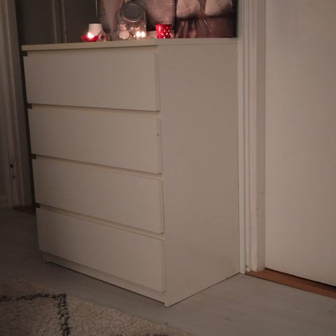 Valkoinen 3-laatikollinen laatikosto. Etuosassa on kolme tilavaa laatikkoa, joissa on pyöreät vetimet. Sopii esimerkiksi makuuhuoneeseen tai olohuoneeseen vaatteiden ja pientavaroiden säilytykseen. Pinnassa on näkyvissä käytön jälkiä ja naarmuja. Haku Helsinki vuosaari, omat kantajat ja en purkaa paloiksi.