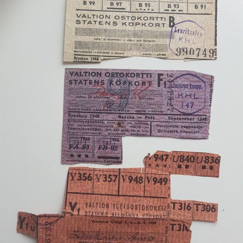 Kaksi sodanjälkeistä valtion yleisostokorttia. Yhteishinta 1e, postitus 1,50e.