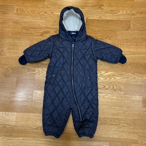 Haalarissa käsille fleecetumput ja napeilla irrotettava huppu.