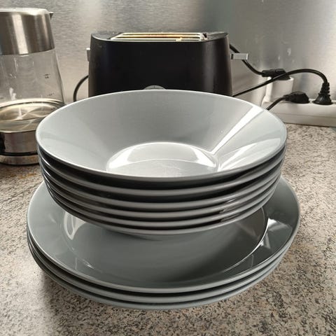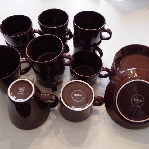 Missään ei halkeamia tai pinttyneitä tahroja. 2 pientä mukia käyttämättömiä, muuten vaihtelevasti ollut käytössä.