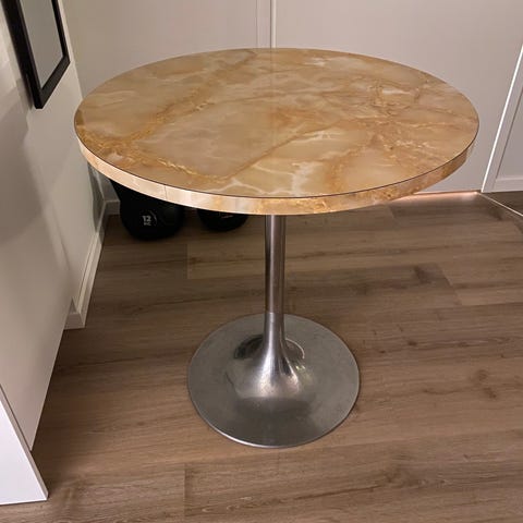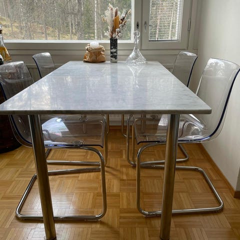 Myydään puoli vuotta sitten ostettu marmori kuvioinen ruokapöytä, pöytäliina käytetty kannen päällä koko se aika. Kestävä keramiikkakansi ja vankka metallirunko takaavat pöydän pitkäikäisyyden ja helppohoitoisuuden. Materiaalit kestävät hyvin käyttöä.