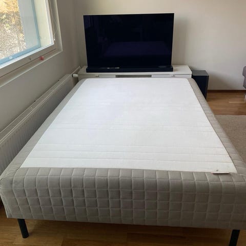Valkoinen Ikea sänky kahdella säilytyslaatikolla