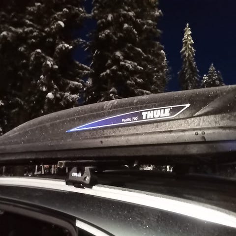 Thule Combibox kultaiselta 80-luvulta, vm 1985. Kotelomallinen malli, jossa saranoitu kansi ja metalliset kiinnitysmekanismit. Sisäpuolella kiinnitysremmit kuorman sitomista varten. Avainkin löytyy. Sisä nettomitat 209 cm pituus ja 33 cm leveys. Muistaakseni neljät laskettelusukset sauvoineen sai ängettyä.