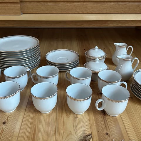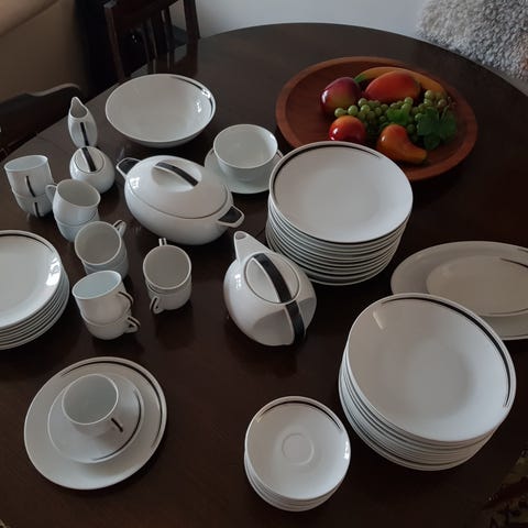 Täydellinen astiasarja ruoka-, keitto- ja leipälautasineen sekä kahvikuppeineen ja erilaisine tarjoiluastioineen. Sarja on hyvin vanha ja kulumaa on varmasti. Lautasia ja kuppeja on kaikkia vähintään 10kpl.