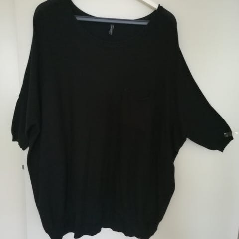 Kaunis musta viskoosinen tunika (tai tunikamekko), jossa kaulus. Pitkät hihat. Levenee alaspäin. Joustaa hyvin.