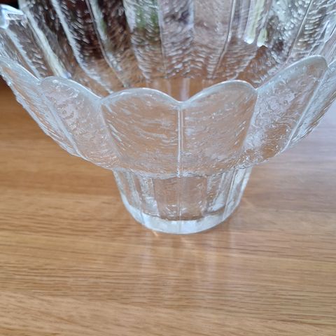 Lasinen koristekulho kirkasta lasia. Kulhossa on epäsymmetrinen, veistoksellinen muotoilu, jossa reunat nousevat korkealle ja muodostavat orgaanisen, jäämäisen pinnan. Sopii esimerkiksi pöydän tai hyllyn koristeeksi tai tarjoiluastiaksi kuiville elintarvikkeille tai pienille esineille. Väri kirkas.