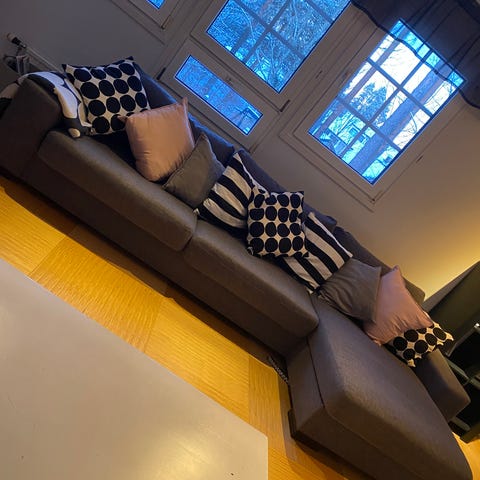 Sohva on muutama kerta pesty tekstiili höyrypesyrilla. Sohva on ehjä ja hyvässä kunnossa.