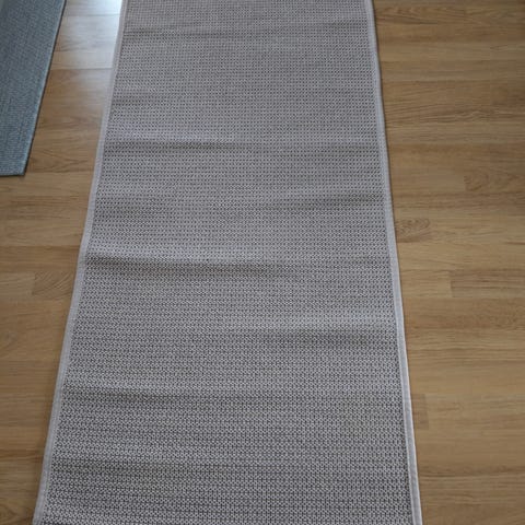 Beige/valkoraidallinen hyväkuntoinen ja siisti matto. Vaatii pesua.