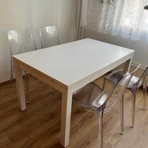 Noin vuosi sitten uutena ostettu valkoinen jatkettava ruokapöytä.