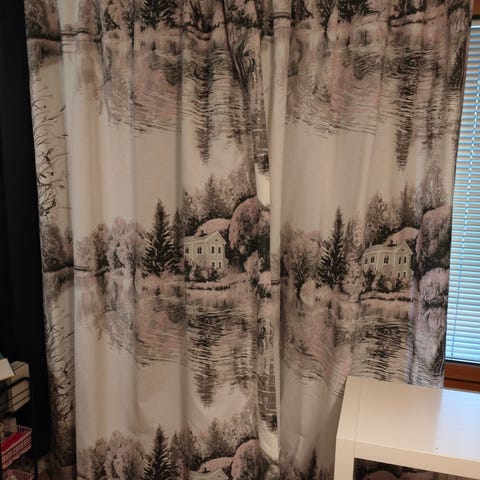 Uudenveroiset verhot. Yläreunassa ryppynauha, johon saa myös ripustus- koukut. Hienopesu 30 asteeessa. Materiaali puuvilla 83% polyesteri 17%. Nouto Laaksolahdesta tai ToriDiili.