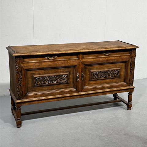 Jykevä antiikkisenkki 1900 luvun alkua, jossa on koristeelliset kaiverrukset ja kierretyt jalat. Senkissä on kolme vetolaatikkoa ja kolme ovea, kaksi hyllyä ovien takana. Rustiikkinen tyyli, joka tuo mieleen perinteisen käsityötaidon ja maalaistalon estetiikan. Sopii hyvin klassiseen sisustukseen.