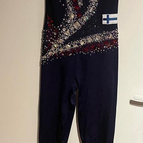 Upea kimaltava musta/vihreä/hopea rytmisen voimistelun kisapuku n. 134-140 mittaiselle.