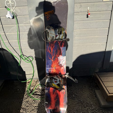 Lauta on käytetty, pohjassa normaalia kulumaa, mutta ei halkeamia tai rakenteellisia vaurioita. Sideet ehjät ja toimivat.