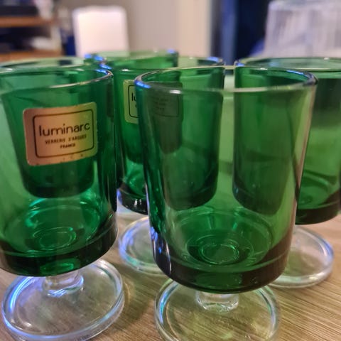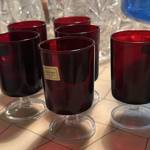 Perus ranskalaisia viinilaseja vailla käyttäjää. Tarrat irronneet yhtä lukuunottamatta. Voidaan pestä tarpeen tullen.