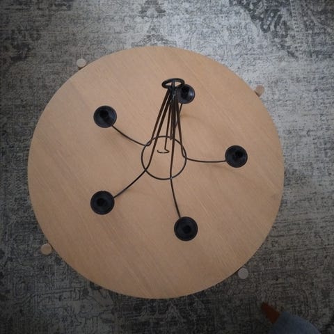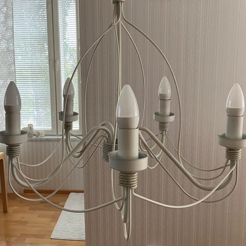 IKEA kattokruunu. Valkoiset varjostimet ovat lasia ja kääntyvät myös halutessa alaspäin.
