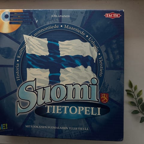 Suomi tietopeli lautapeli, jossa kysymyskortteja, pelilauta, pelinappuloita ja kysymys-DVD. Peli käsittelee Suomeen liittyviä aiheita, kuten historiaa, maantietoa ja kulttuuria.