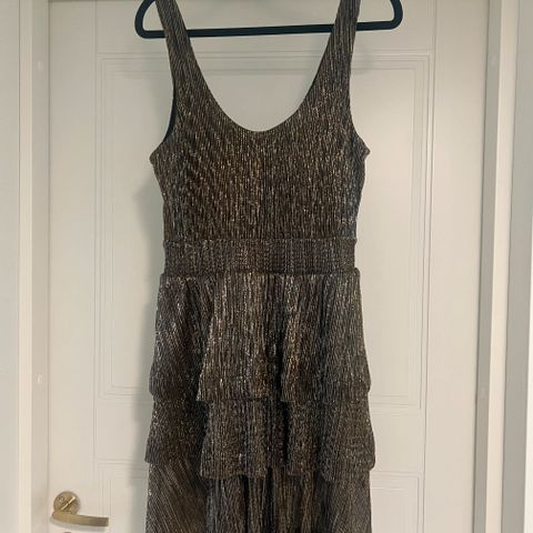 Musta kimalteinen Vero moda juhlamekko. Kokolappu leikattu irti,mutta sanoisin olevan M-L kokoa. Kunto siisti, käytetty.