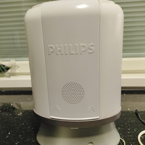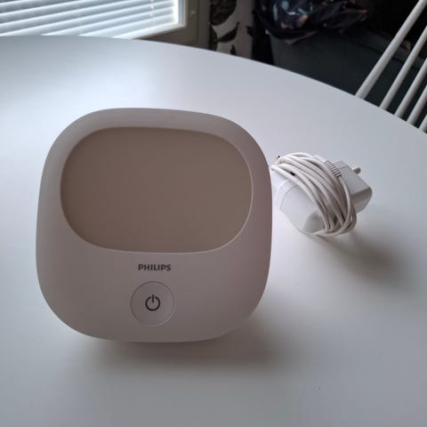 Philips HF3520 herätysvalo. Valkoinen, pyöreä malli, joka toimii herätysvalona ja pöytälaitteena. Laitteessa on ohjauspainikkeet etuosassa sekä ilmanvaihtoaukot takana. Sopii käytettäväksi makuuhuoneessa luonnonvaloa jäljittelevänä herätysvalona ja yövalona. Toimii verkkovirralla, laitteen tyyppikilpi ja tekniset tiedot sijaitsevat takapuolella.