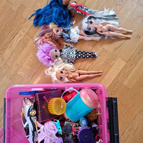 Myydään kuvan LOL setti. Yksi isompi lol nukke, 6 normaali kokoista, yksi koira ja yksi pieni lol hahmo. Ja kuvan varusteet.