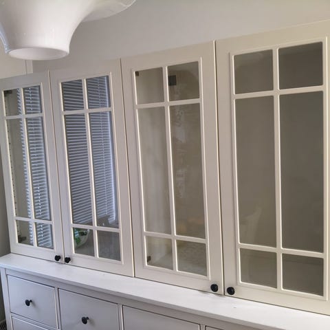 Kaapissa Ikea:n Avsikt satin silver "huurrettu" lasiovi. Ovessa hidaste.