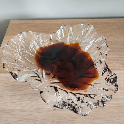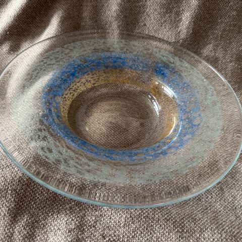 Myydään harvinainen koristevati, valmistettu tunnetulla suomalaisella Humppilan lasitehtaalla. Suunnittelija on Pertti Santalahti, yksi 1970-luvun merkittävimmistä muotoilijoista. Alapohjassa kaiverrus: “Humppila Finland – Pertti Santalahti – käsintehty”.