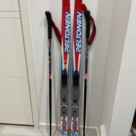 Lasten Peltonen-hiihtosukset nnn-siteillä sekä Apollo-sauvat. Suksien pituus 100 cm ja sauvojen 80 cm. Kunto molemmissa erittäin hyvä.