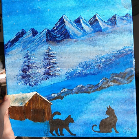 maalattu taulu kissa keinussa iltataivas