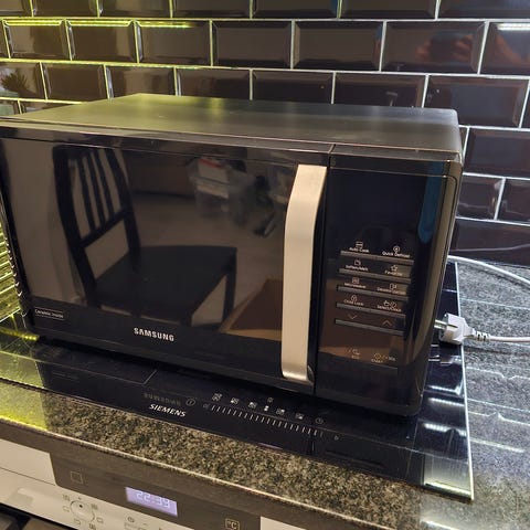 Laitteessa on useita automaattiohjelmia, sulatustoiminto sekä sisällä lasinen pyörivä lautanen.