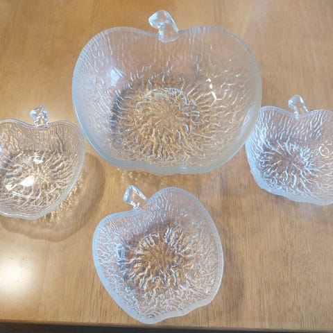 Ihanat vintaget omenan muotoiset lasikulhot. Isoin kulho toimii vaikka salaatti- tai sipsikulhona ja pienet esimerkiksi jälkiruoka- tai tarjoilukulhoina. Erinomaisessa kunnossa, eikä juurikaan käytönjälkiä.😊