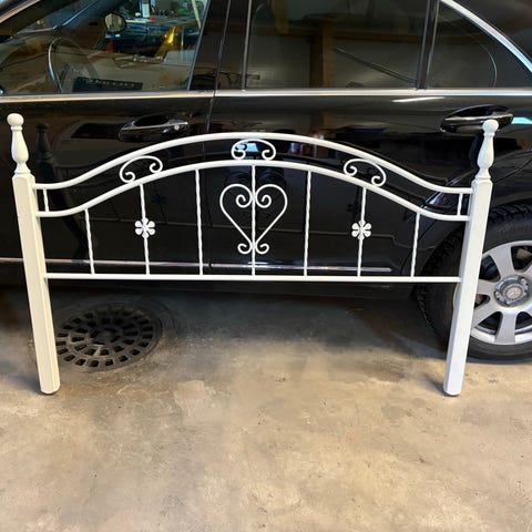 Valkoinen pehmeä sängynpääty, jossa on selkeä ja yksinkertainen muotoilu. Pääty on verhoiltu kankaalla ja siinä on pehmeä pinta.