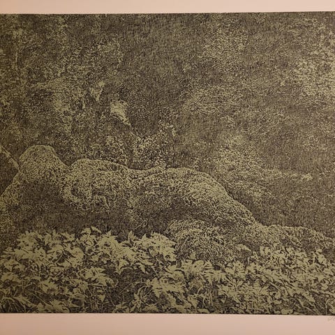 Taiteilijaprofessori Olavi Lanun Grafiikan työ vuodelta 1989. Koko: leveys 106 cm ja korkeus 74 cm. Vedoksen numero 7/10.