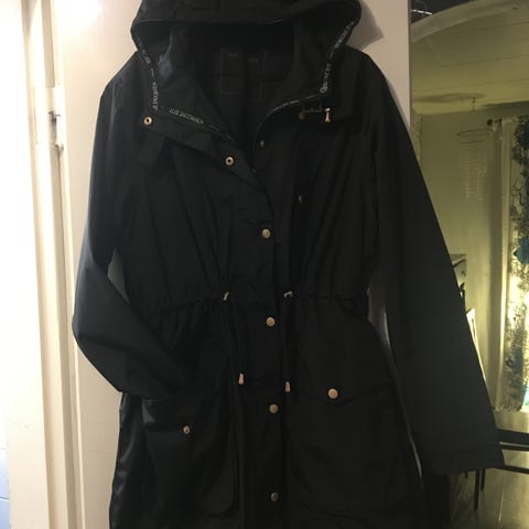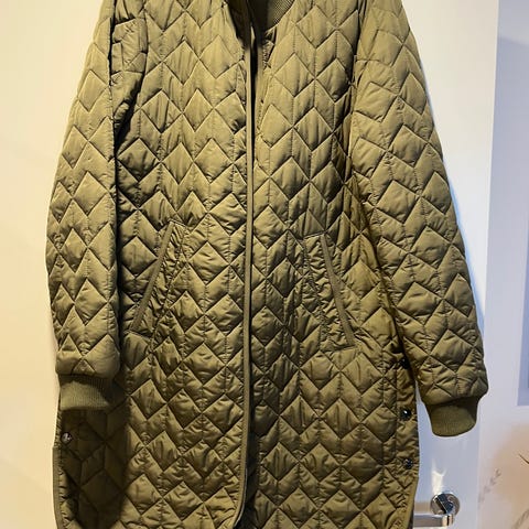 Ilse Jacobsen pitkä takki, koko 42. Oliivinvhreä, tikattu malli, jossa etuvetoketju ja sivutaskut. Materiaali 100 % polyesteriä. Sopii käytettäväksi päällystakkina viileämpiin keleihin. Ihana malli ja kaunis istuvuus.