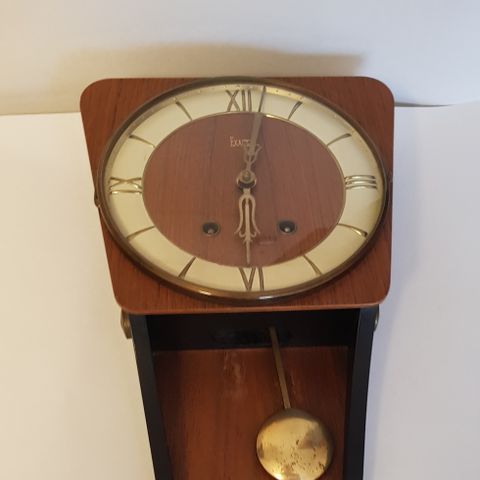Antiikkinen Seinäkello, jossa on koristeelliset yksityiskohdat ja roomalaiset numerot kellotaulussa. Kello on varustettu heilurilla ja mukana avain.