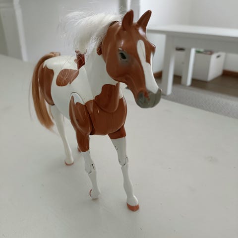 Hevonen on hyväkuntoinen. Mukaan kuuluu satula. Suitset ovat menneet rikki. Mahan alla on kankaan sisällä piilossa patterikotelo. Kun korvasta painaa niin hevonen ääntää.