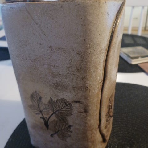 Keraaminen vaasi, jossa suorakulmainen muoto ja luonnonsävyinen lasitus. Pinnassa on kaiverrettu lehtikuvio. Sopii esimerkiksi kukkavaasiksi tai sisustusesineeksi pöydälle tai hyllylle. Materiaalina keraaminen savi.