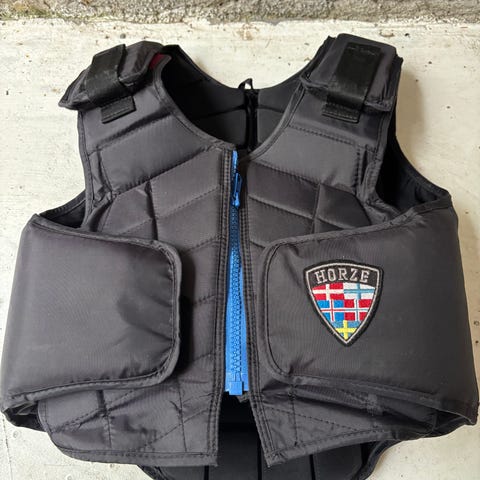 Horzen hyväkuntoinen turvaliivi ratsastukseen. Malli, jossa vetoketjukiinnitys. Soveltuu ratsastuskäyttöön tarjoamaan vartalonsuojaa kaatumis- ja isku tilanteissa. Koko 4XS (128 cm). Meillä ollut käytössä n. 125 cm pitkällä.