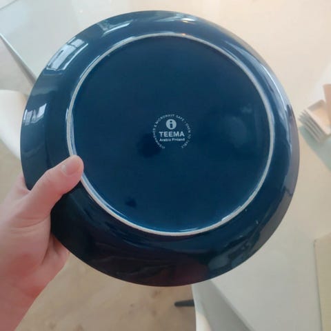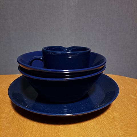 Iittala Teema sininen astiasto, johon kuuluu useita erikokoisia lautasia ja kaksi kulhoa. Lautaset ja kulhot ovat samaa tummansinistä sarjaa. Ei säröjä, mutta ovat olleet käytössä monta vuotta.