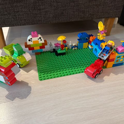 Lego Duplo rakennus- ja ajoneuvosetti, jossa on useita ajoneuvoja, rakennuspalikoita ja tarvikkeita. Kokoelmaan kuuluu muun muassa paloauto, ambulanssi ja muita ajoneuvoja, rakennuksia muistuttavia osia, vihreä pohjalevy sekä erilaisia peruspalikoita useissa väreissä. Setissä on myös Duplo-hahmoja ja pieniä lisäosia, kuten aitoja ja eläinhahmoja. Sopii yhteensopivaksi muiden Lego Duplo -osien kanssa ja tarjoaa mahdollisuuden rakentaa erilaisia kaupunki- ja leikkimaailmoja.