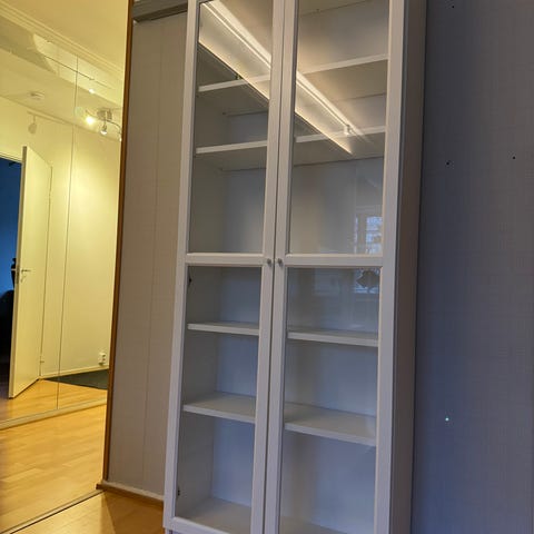 Myynnissä valkoinen vitriinikaappi. Kolme kiinteää puuhyllyä. Lukko+avain ovessa. Kaapin sisäosa vaalea.