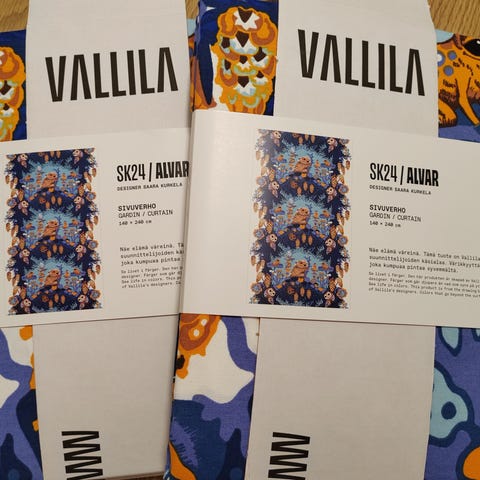 Vallilan Suvannontie verhot 2 kpl, mitat 140* 245 cm, hyväkuntoiset, alareunasta lyhennykset purettu joten sinne taittunut sauma kuten yhdessä kuvassa näkyy, muuten hyväkuntoiset ja väreiltään kirkkaat verhot, kissatalous.