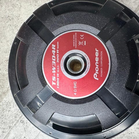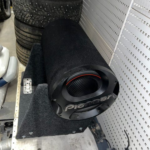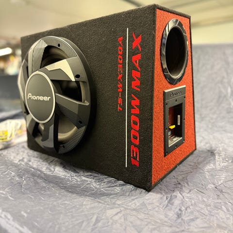 Pioneer TS-WX301 subwoofer kotelossa. Subwooferin maksimiteho ilmoitettu kotelossa 1000 W. Kotelossa refleksiputki etupaneelissa ja verhoiltu pinta sivuilla. Mukana näkyy olevan erillinen vahvistin sekä kaapeleita ja liittimiä auton äänijärjestelmän kytkentää varten. Soveltuu auton bassotoistoon osana autohifijärjestelmää.