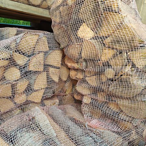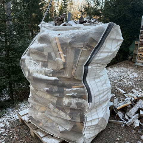 Havupuusta tehtyä polttopuuta 60 litran säkkeihin pakattuna.