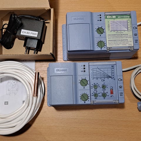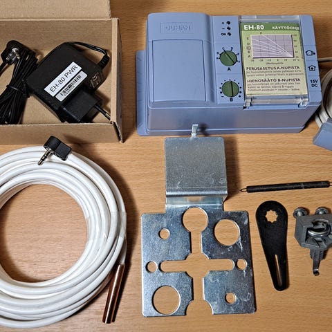 Täydellinen säädinsarja, asennusvalmis paketti, säädinyksikkö on huollettu ja testattu, 15 metrin ulkoanturi, virtalähde, karasovite, asennuslevy sekä ohjeet.