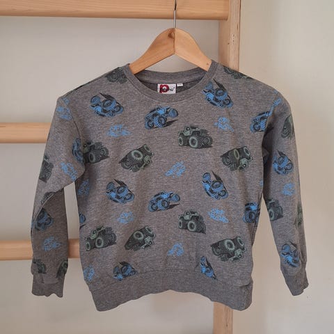 Siisti Peuhun harmaameleerattu hälytysajoneuvokuvioitu collegepaita kokoa 130cm, vastaa noin 128cm kokoa. Pientä nyppyä resoreissa. Pehmeä harjattu sisäpinta kankaassa.