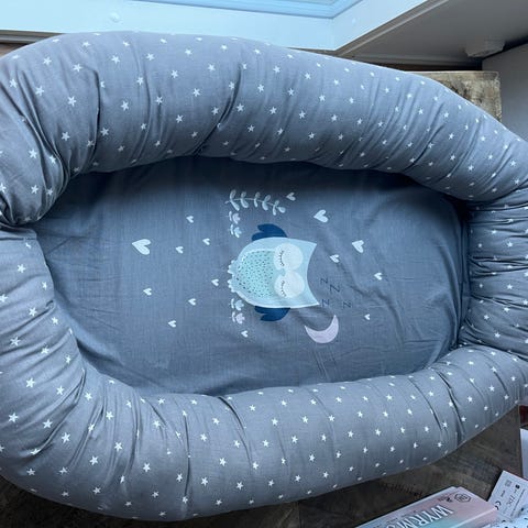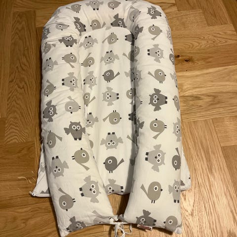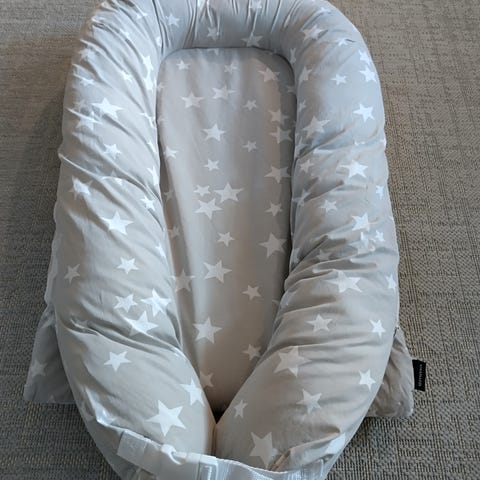 NG Baby unipesä. Koko noin 75cm*50cm*17cm, eri tavallista hieman suurempi. On ollut erinomainen unipesä meidän kaksosille jopa 5kk asti.